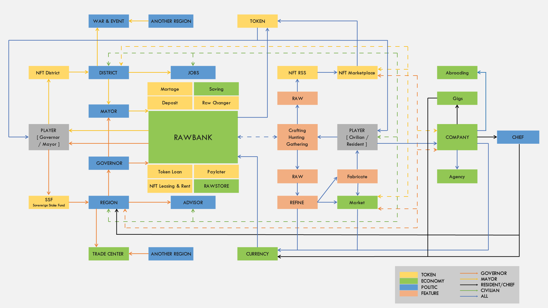 The Governor can earn income in the form of tokens through various bank features by depositing tokens (in-game staking). The Governor can also invite other players to invest in the RAW-Bank via token deposits.